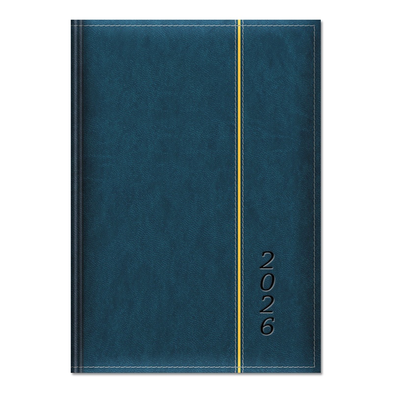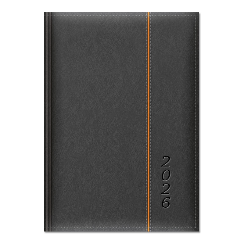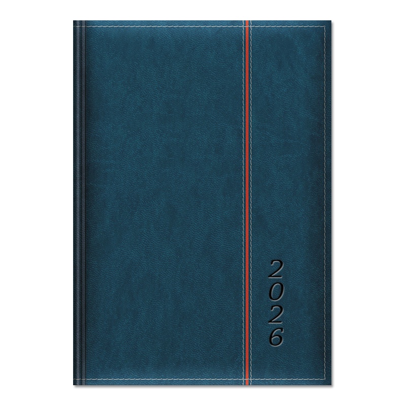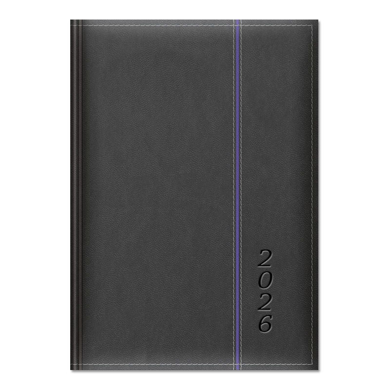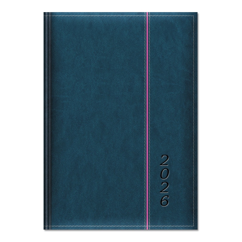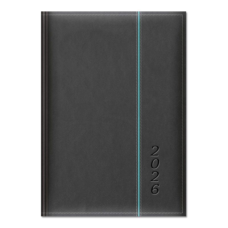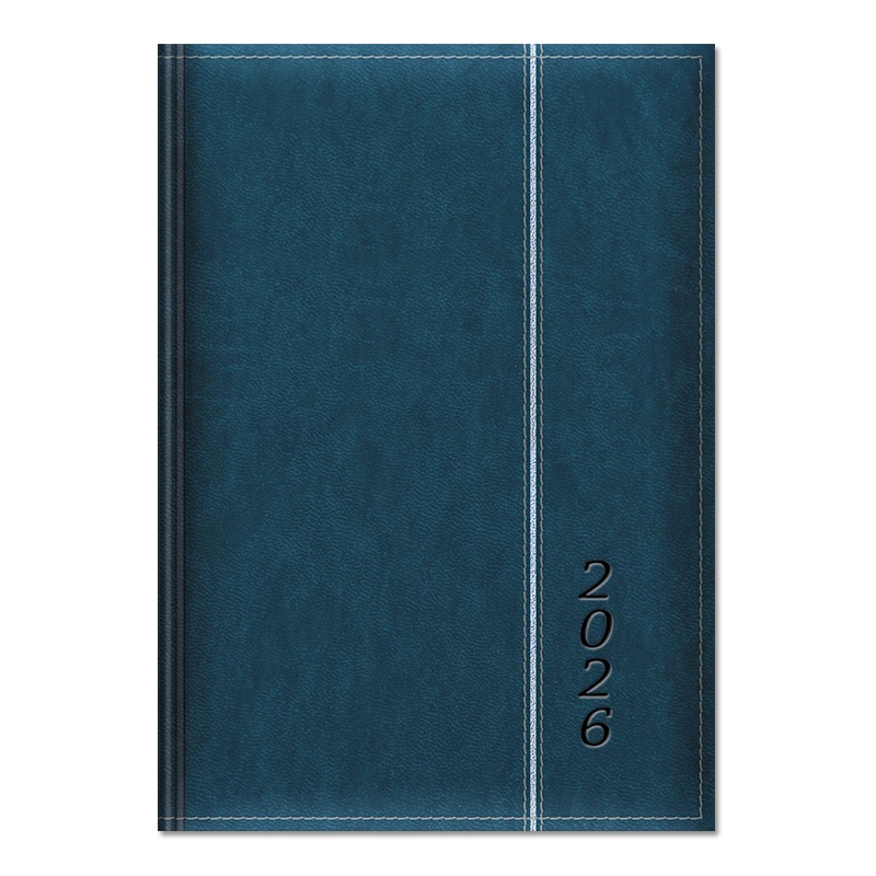 Oprawa twarda zmiękczona gąbką, SIMPLE z eleganckim przeszyciem i kontrastującym wąskim pionowym paskiem z materiału VIVELLA. Rok tłoczony na gorąco z przebarwieniem, możliwość głębokiego tłoczenia logo firmy.